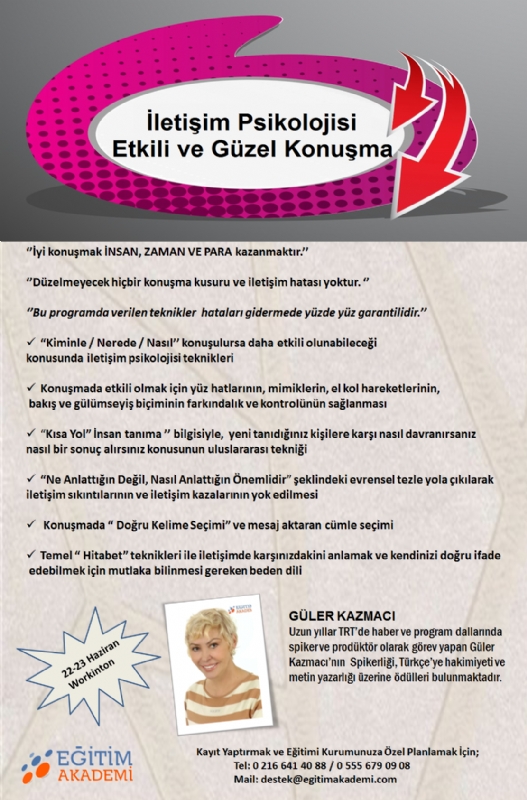 22-23 Haziran tarihlerinde açılacak Güler Kazmacı ile "İletişim Psikolojisi - Etkili ve Güzel Konuşma" açık eğitimine sizleri de bekleriz...